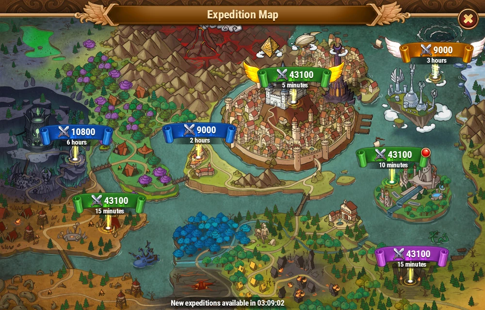 There are 8 possible Expeditions on 7 slots each day offering random Artifact Resources and amounts. The power required and the rewards depend on the total power of a player's five most powerful heroes. The 6th slot requires VIP level-8 and the 7th slot requires Valkyrie's Favor for 2 more Expeditions a day.