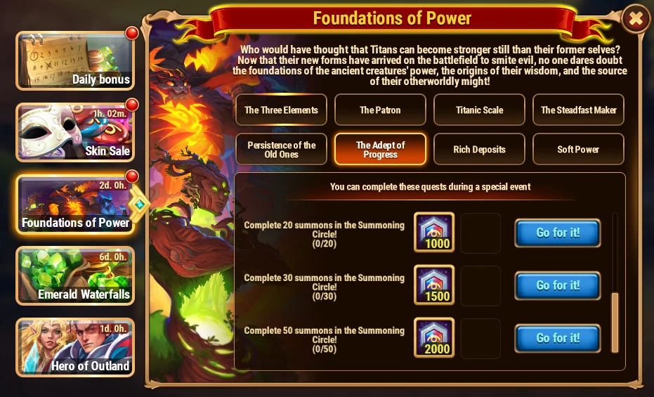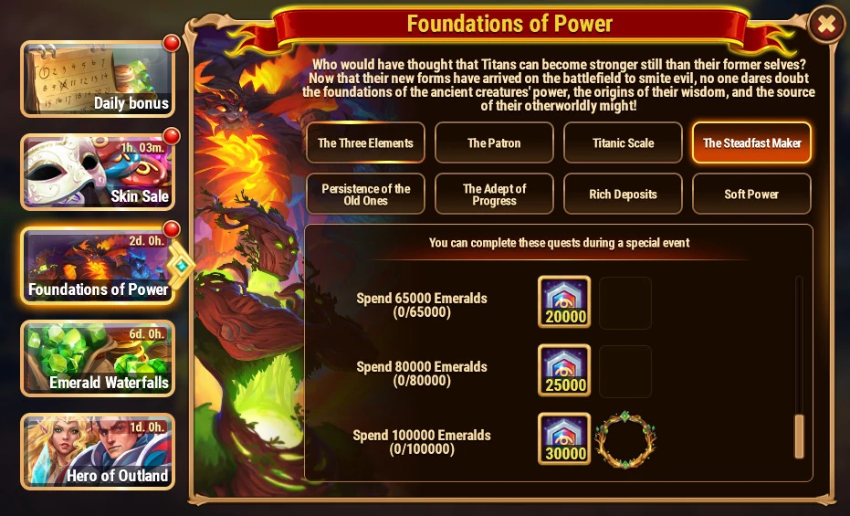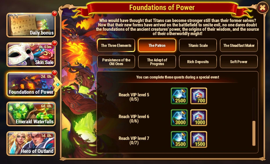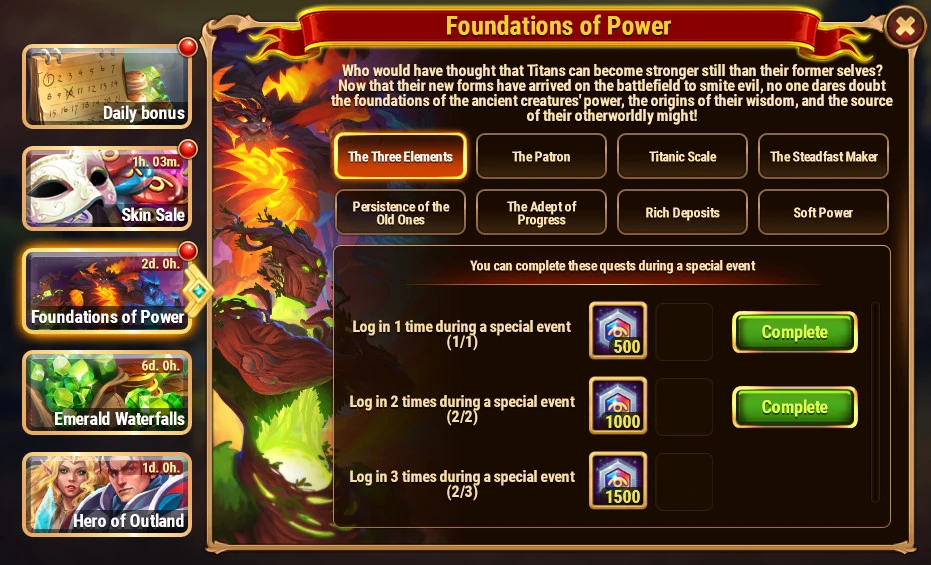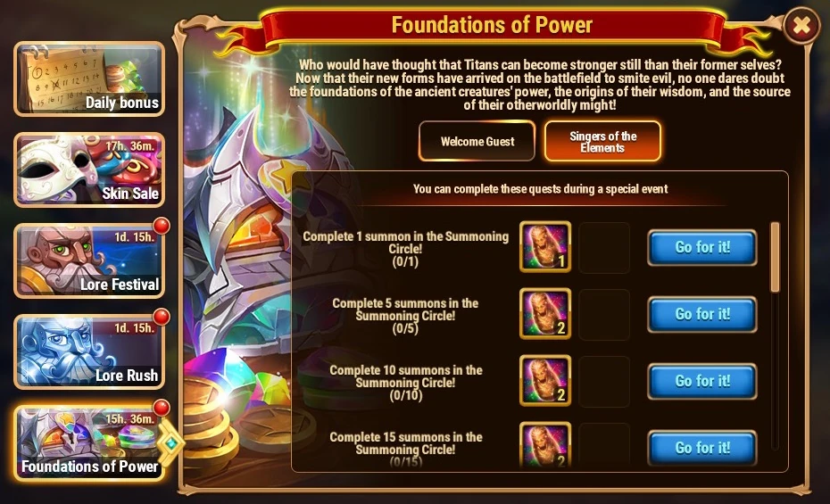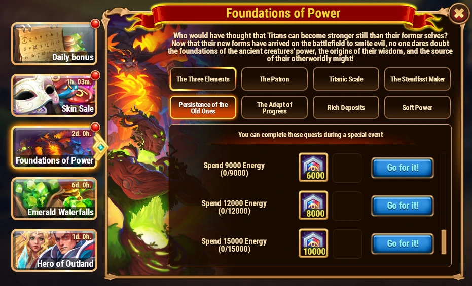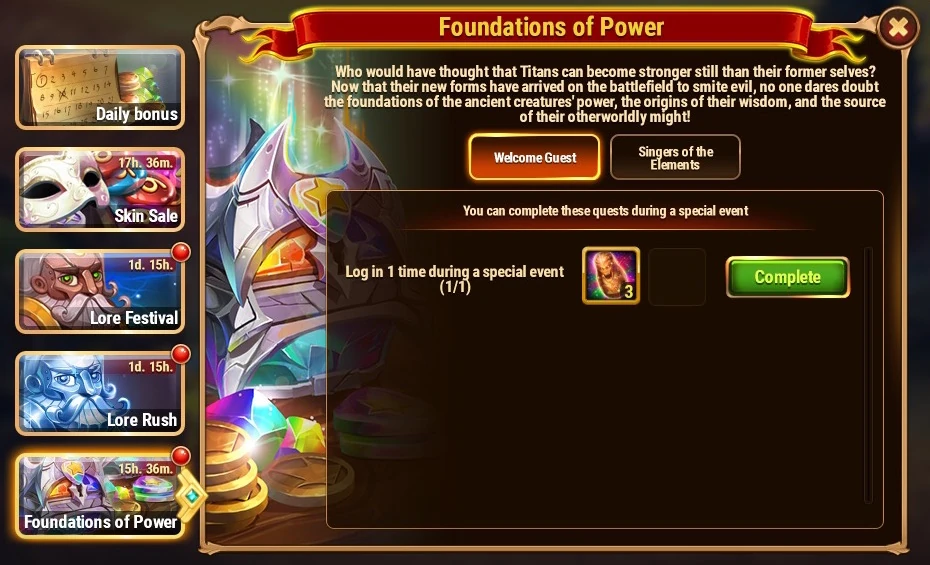 Foundations of Power usually is a 3-day event, however, in September 2022 it also occurred in two different 1-day formats: On September 6, the quests and reward levels were based on Children of Prophecies (from 2021) and on September 11, the quests and reward levels were based on the usual 3-day format, simply turned into a 1-day event which was then accompanied by another shortened 1-day version of Riotous Growth.