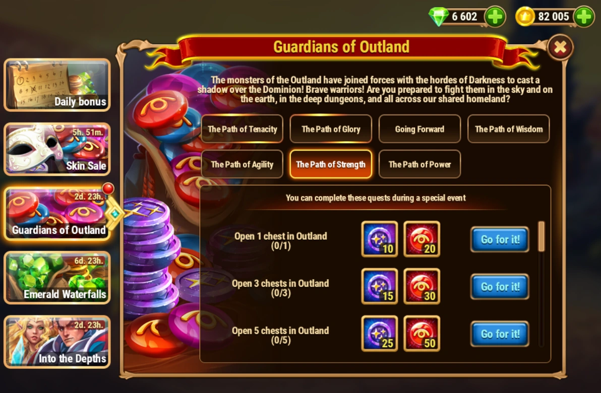 Guardians of Outland usually is a 3-day event, however, in September 2022 the event occurred as a special 1-day event for the first time. All quests and reward levels remained exactly the same (except for The Path of Tenacity). The event was accompanied by another shortened 1-day version of Scorching Days, giving players the opportunity to "double-dip" on quests with similar requirements. There are 65 tasks for this event.